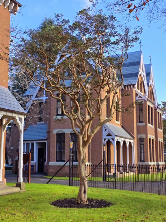 Hardy, smaller evergreen tree Native to Chile with attractive dark green, waxy foliage set against warm orange-brown bark. Clusters of small white flowers cover the tree mid to late summer followed by deep red–purple edible berries. Suits hedging or screening. Grows to 5m.
